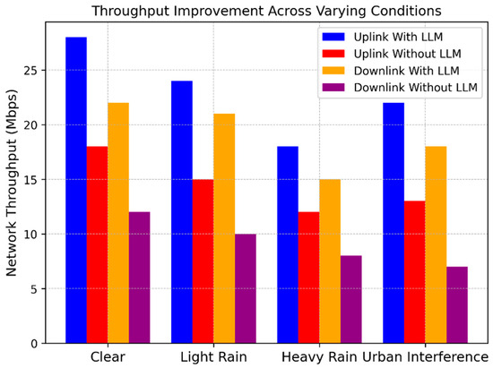 Figure 8 presents the network throughput under varying environmental conditions, comparing scenarios with and without the use of LLMs. It is clearly shown in Figure 8 that LLM management significantly enhances network performance across all conditions. Particularly, uplink throughput with LLMs remains high even in adverse conditions like heavy rain and urban interference, surpassing scenarios without LLMs. Similarly, downlink throughput with LLMs shows considerable improvement over downlink without LLMs, demonstrating the effectiveness of LLMs in maintaining high throughput levels despite environmental challenges. This figure effectively highlights the benefits of integrating LLMs into network management, showcasing its capability to sustain high performance across diverse conditions.