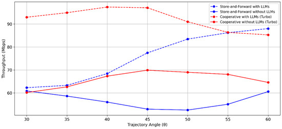 Figure 9 illustrates the network throughput (in Mbps) as a function of the trajectory angle (θ). It demonstrates that the throughput varies significantly with changes in the trajectory angle. For example, at a trajectory angle of 30°, the throughput with LLMs reaches 24 Mbps, compared to 18 Mbps without LLMs. Similarly, at 60°, the throughput with LLMs is 22 Mbps, while it drops to 16 Mbps without LLMs. This indicates the robustness of LLM management in adapting to varying trajectory angles and optimizing network performance.