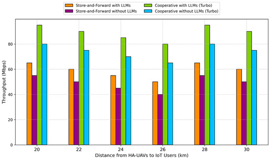 Figure 10 depicts the network throughput (in Mbps) as a function of the distance from HA-UAVs to IoT users. It shows that throughput decreases as the distance increases. For instance, at a distance of 20 km, the throughput with LLMs is 25 Mbps, compared to 20 Mbps without LLMs. At 30 km, the throughput with LLMs is 18 Mbps, whereas it drops to 12 Mbps without LLMs. This demonstrates the effectiveness of LLMs in enhancing network performance over longer distances.