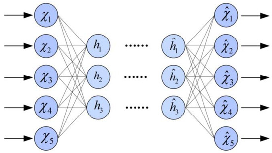The autoencoder (AE) represents a well-known model in the domain of unsupervised deep learning neural networks. It consists of multiple, nonlinear processing layers designed to learn the distribution features and representations of nonlinear data. The structure of the autoencoder, as shown in Figure 1, comprises two main components: an encoding layer and a decoding layer [36]. The encoding layer transforms the input features into a compact representation, preserving the essential data characteristics and removing unnecessary details from the features, while maximizing the retention of essential information in the features. This is computed through the following formula: