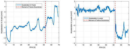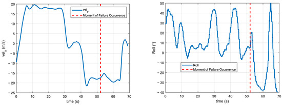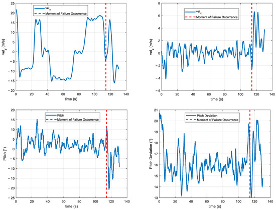 From Figure 5, it can be seen that, when the UAV’s rudder is stuck to the right, certain features exhibit significant changes after the failure. The acceleration features ( and ) show noticeable fluctuations after the failure, particularly a significant increase in amplitude after the red-dashed line, indicating substantial changes in the acceleration characteristics in these directions following the rudder deviation. Although also shows some changes, they are less pronounced than those of and . The velocity features ( and ) display significant fluctuations after the failure, especially more pronounced changes in , suggesting instability in the UAV’s speed following the rudder deviation, while the changes in are relatively smaller. The roll characteristics (roll and roll command) show an increased deviation between the actual and desired values after the failure, indicating instability in the roll control. Similarly, the yaw characteristics (yaw and yaw command) exhibit significant differences after the failure, with the actual values deviating more from the desired values, suggesting that the yaw control is affected. In summary, the acceleration features ( and ), velocity features ( and ), roll, and yaw show significant changes after the rudder deviation failure, indicating that these features are closely related to the failure and can serve as important references for anomaly detection and fault diagnosis.
