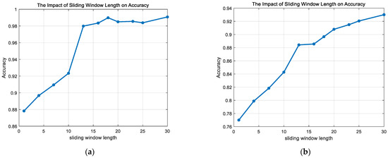 The impact of different sliding window lengths on the anomaly detection accuracy: (a) engine failure; (b) rudder and aileron at zero.