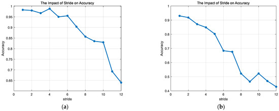 Impact of different strides on anomaly detection accuracy: (a) engine failure; (b) rudder and aileron at zero.