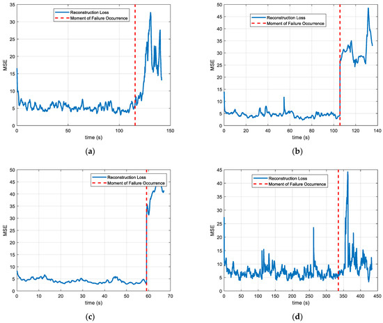 In Figure 8, it can be seen that for the rudder anomalies, there is a significant difference between the normal data and the anomalous data reconstructed by the CAE. However, for the “rudder and aileron at zero” anomaly, a small portion of the reconstruction error values for the anomalous data are close to those of the normal data. For the right aileron anomaly, a larger portion of the reconstruction error values for the anomalous data are close to those of the normal data, making it difficult to determine a threshold that distinguishes between the normal and anomalous data.