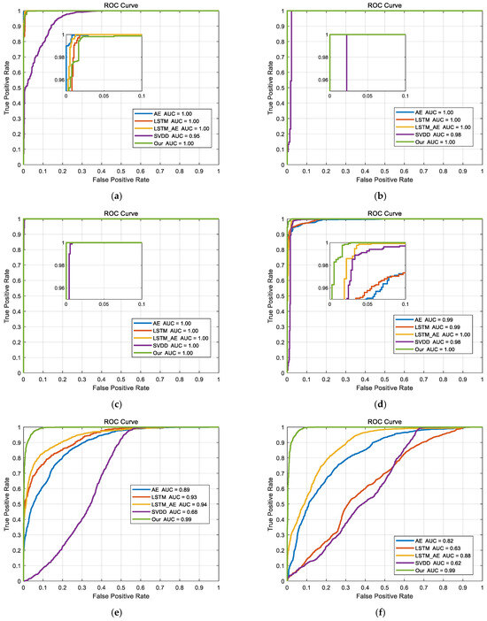 Both SVDD and the proposed method use the Gaussian kernel function. The parameter for regularization was selected from , and the Gaussian kernel parameter was selected from , where denotes the mean Euclidean distance across all training instances [41]. The iteration numbers for the AE, LSTM, and LSTM-AE were set to 400, using the Adam optimizer and the mean squared error (MSE) as the loss function. The learning rate for the AE was 0.001, while the learning rate for the LSTM and LSTM-AE was 0.0008. The rest of the experimental environment was consistent with that of the previous experiment. For anomaly detection, the AE, LSTM, and LSTM-AE detected anomalies by evaluating the residuals between the original dataset and the observed data against a specified threshold. To ensure fairness in the experiments, the 3σ principle was used to select the threshold for the comparative experiments. The SVDD and CAE-L0/1-SVDD distinguished between the normal and anomalous samples using a hypersphere.