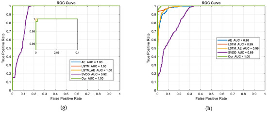 ROC curves for different anomaly detection methods: (a) engine failure; (b) rudder stuck to the left; (c) rudder stuck to the right; (d) elevator stuck at zero; (e) left aileron stuck at zero; (f) right aileron stuck at zero; (g) both ailerons stuck at zero; (h) rudder and aileron at zero.