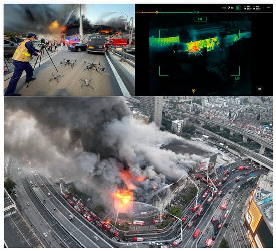- DJI. Drones Assist in Fire Rescue of Large-Scale Urban Complexes in Nanjing. Available online: https://enterprise-insights.dji.com/cn/blog/nanjing-drone-mall-fire-rescue/ (accessed on 25 July 2024).