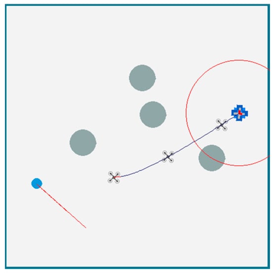 The simplified SAR scenario of the UAV is represented by a two-dimensional rectangular area with a length of and a width of , where our UAV is represented by a dark blue UAV icon, and the target waiting to be rescued is represented by a blue circular icon. The green lines located at the boundary of the square area represent the barriers of the area. There are dark green circular areas with a radius of , representing obstacles or danger zones. The UAV is equipped with sensors to observe the velocity and direction of approaching objects, whose sensing range is indicated by a red circle in Figure 2.