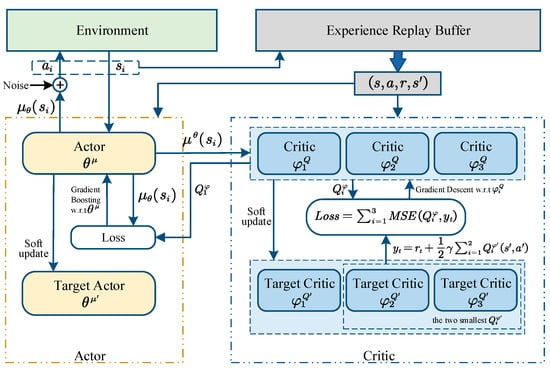 In this paper, an improved deep deterministic policy gradient with three critic networks (DDPG-3C) is proposed. The framework of the DDPG-3C decision model is shown in Figure 3.