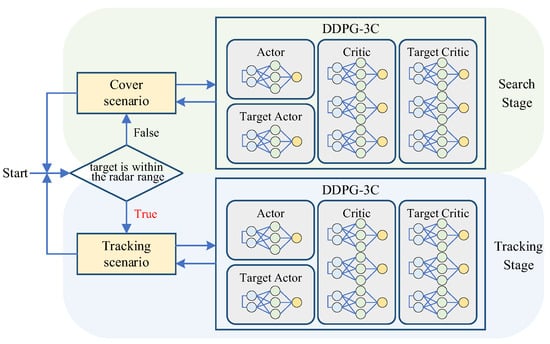 This paper proposes a two-stage target search and tracking method, which divides SAR tasks into search stage and tracking stage. In the search stage, the specific optimization of the search algorithm aims to cover broader areas and quickly find targets. Once a target is detected, the focus shifts to optimizing the ability to track dynamic targets, including adapting to changes in the target’s speed and direction. The controllers for each stage are trained based on the proposed DDPG-3C algorithm. The diagram of the proposed two-stage target search and tracking method is shown in Figure 4. When implementing, if the target is not within the radar range of the UAV, the UAV will make decisions according to the model trained in the cover scenario to search for targets. If the target is detected by the radar, the UAV will turn to tracking mode.