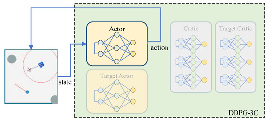 As is shown in Figure 3, the DDPG-3C uses an Actor–Critic (AC) framework, and there are eight networks: one actor network , one target actor network , three critic networks , and three target critic networks . Our UAV can be treated as an agent containing a DDPG-3C decision model. When the agent obtains a state from the environment, the actor network outputs an action according to the input state and takes the next step . Meanwhile, the environment returns a reward . Then, the agent stores the data in the experience replay buffer. The agent updates its critic and actor networks by sampling mini-batches from the experience replay buffer.