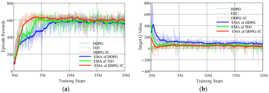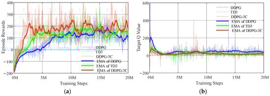 The DDPG, TD3, and DDPG-3C models are trained under the same conditions using hyperparameters listed in Table 2. Training results are analyzed using an exponential moving average (EMA) according to Equation (19) to smooth the data and highlight trends more effectively. Moreover, the detailed convergence rewards and convergence steps are listed in Table 5.
