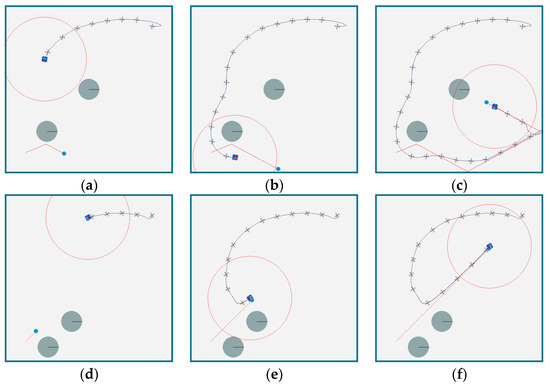 Figure 9 shows the experimental results of the proposed two-stage target search and tracking method for SAR tasks, which include avoiding obstacles, searching for targets, and tracking the target. In Figure 9a–c, the UAV’s initial position is (700, 700), with a random initial angle, and an initial speed of 0. The target’s initial position is (100, 100), with a speed of 30 m/s and an initial angle is . The positions of the obstacles are (200, 200) and (400, 400). In Figure 9d–f, the UAV’s initial position is also (700, 700), with a random initial angle and an initial speed of 0. The target’s initial position is (100, 100), with a speed of 30 m/s and an initial angle of , while the obstacles are located at (200, 80) and (350, 200).