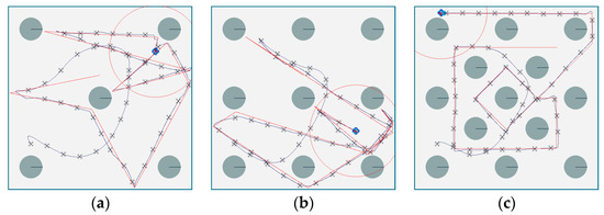 Experimental results of two-stage target search and tracking with varying numbers of obstacles: (a) 5 obstacles; (b) 9 obstacles; (c) 13 obstacles.