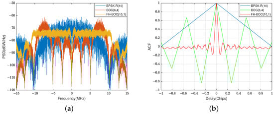 The PSDs and ACFs of FH-BOC(10,1), BOC(6,4), and BPSK-R(10) signals with bandwith of approximately 20MHz. (a) The PSDs of FH-BOC(10,1), BOC(6,4), and BPSK-R(10) signals. (b) The ACFs of FH-BOC(10,1), BOC(6,4), and BPSK-R(10) signals.