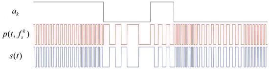 where stands for the data code, the spread spectrum code can be symbolized by , represents a frequency-hopping subcarrier, denotes the frequency of the frequency-hopping subcarrier where the k-th spread spectrum code is located, and the duration of the spreading code slice is . In addition, the subcarrier phase of the FH-BOC-modulated signal has sinusoidal and cosine phases. Thus, is expressed as Equation (2):