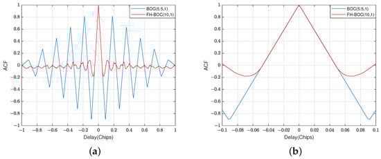 The ACFs of the sinusoidally phased FH-BOC(10,1) signal and BOC(5.5,1) signal. (a) Illustrates the ACFs of the two signals within code slices of the pseudo-code delay. (b) Illustrates the ACFs of the two signals within code slices of the pseudo-code delay.
