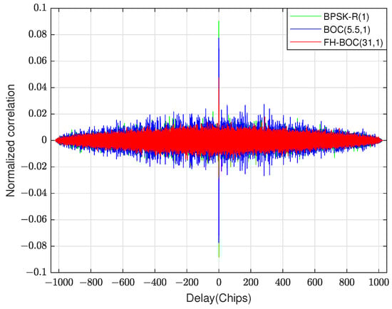 The FH-BOC modulation system has good cross-correlation characteristics. The normalized cross-correlation results of FH-BOC(10,1) and BPSK-R(1), and BOC(5.5,1) and FH-BOC(31,1) are shown in Figure 5, respectively: