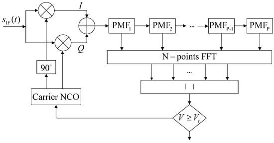 The PMF-FFT acquisition algorithm uses FFT to make the two-dimensional search in the pseudo-code phase and Doppler frequency into a one-dimensional search in the pseudo-code phase, and uses multiple PMFs to reduce the integration time used to search a pseudo-code phase. The sampling frequency is , and one pseudo-code period is T. Therefore, the number of sampling points in a pseudo-code period is . The number of PMFs is P and the length of the PMF is X, and then (). When the received signal is demodulated, it will be equally divided into P parts, and in order to prevent the length of the last PMF being inconsistent with the lengths of the other PMFs, it is necessary to perform the first complementary zeros, and the number of complementary zeros is . The function of the PMF is to partially despread the demodulated signal, and the outputs of the PMFs are partially correlated results. The Doppler frequency estimate can be calculated by performing an N-point FFT operation on the P results. The process diagram of the PMF-FFT acquisition algorithm is shown in Figure 8: