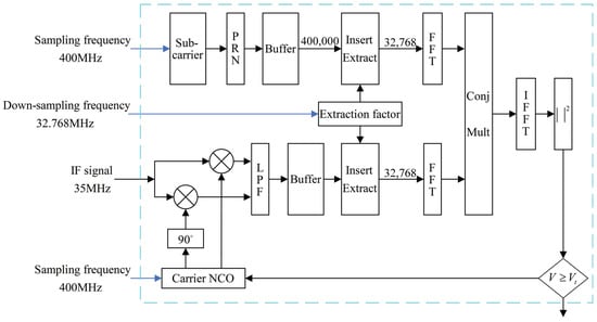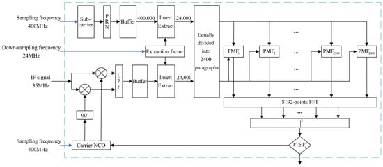 The maximum PMF-normalized gain attenuation for the Doppler frequency within is about 0.9. The detailed design for the PMF-FFT acquisition algorithm is shown in Figure 12: