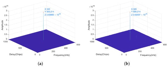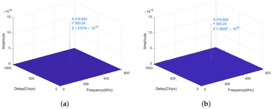 The results applied by the parallel phase acquisition algorithm to capture the FH-BOC(10,1) signal. (a) Shows the acquisition result when the SNR is 0 dB. (b) Demonstrates the acquisition result when the SNR is −25 dB.