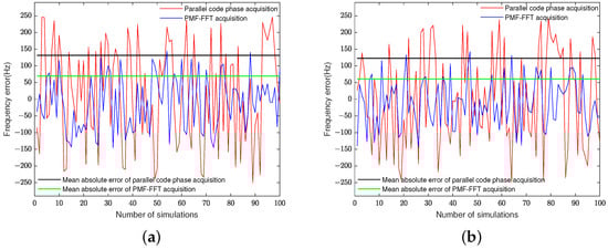 - The maximum frequency error of the parallel code phase acquisition algorithm is and the maximum phase error is 0.0156 code chips, whereas those of the PMF-FFT acquisition algorithm are 146.48 Hz and 0.0213 code chips, respectively;