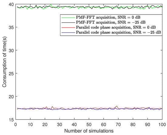 The acquisition time of the parallel code phase acquisition algorithm is lower than that of the PMF-FFT acquisition algorithm. The Matlab simulation elapsed time is shown in Figure 18, which can reflect the acquisition time performance of the two algorithms from the side: