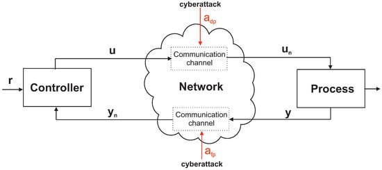 Although disclosure attacks are of greater interest in information-theoretic studies [] (e.g., eavesdropping), in networked control systems, this can also have dire consequences because a malicious third party can have access to data involving the dynamics of the physical process, which can be further used in more complex cyberattacks in the future (inference attacks). In discussing deception and disruption attacks, we will make use of the generic networked control structure from Figure 1, where the cyberattacks are at the network level, either on the direct-actuator path () or the feedback-sensing path (). In a deception attack the signals send through the network are corrupted, for example through false data injection (this is sometimes referred to as a man in the middle attack—MitM). Such attacks can be modeled as