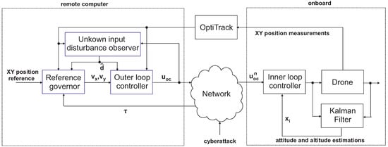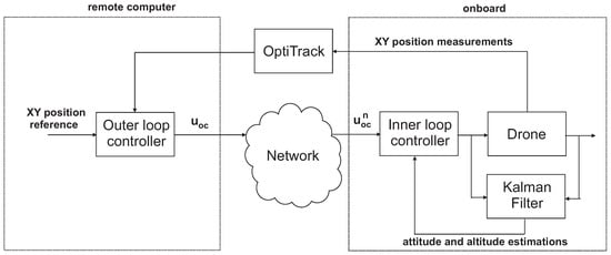 We start from the baseline network control structure from Figure 2. The control structure is split into an inner loop and an outer loop. This relies on the assumption that the inner loop is much faster than the outer loop []. The inner loop controller is onboard the drone and controls the attitude (Euler angles—pitch, roll, yaw) and the altitude, based on onboard estimates from a Kalman filter. The outer loop control runs on a remote computer, uses the measurements from a motion capture system, and controls the positions. It is important to note that the network is only on the direct path, because the position feedback is performed through the motion capture cameras. The networked control structure has the following benefits: (i) it addresses the drone hardware limitations, by moving a part of the control on a remote computer (outer control loop); (ii) it permits accurate position measurements from a motion capture system like OptiTrack (as alternative to onboard measurements and estimates); and (iii) the transmission delays and packet loss due to wireless transmissions are minimized by sending smaller data packets only one way.