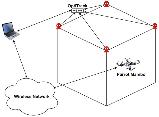This section will present some experimental results for the two cyberattack scenarios discussed throughout the paper: DoS and MitM. The experimental setup is given in Figure 5. The Parrot Mambo drone (Figure 3) communicates wireless via Bluetooth with a remote computer (Intel i7 processor, 16GB RAM, Windows 11). The Parrot Mambo drone has m, weights only 0.063 kg, and the propellers are actuated by four DC motors. As onboard sensors, the drone has an accelerometer, a gyroscope, an ultrasound sensor, a barometer, and a temperature sensor. The software interface with the sensors, actuators and network communication is made possible due to a firmware specifically developed for Matlab []. An OptiTrack motion camera system with four cameras is connected to the remote computer. As software running on the computer, we used MATLAB and Simulink Real Time for networked control, and the OptiTrack Motive 1.8.0 software for data capturing, which communicates with Simulink through a middleware client-server application.