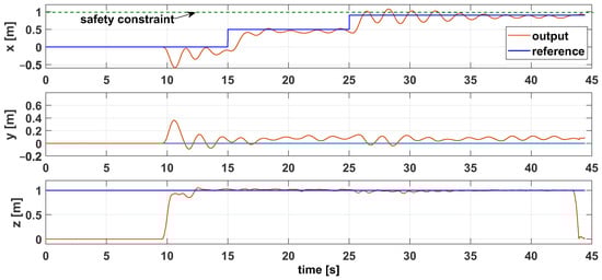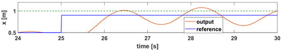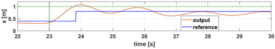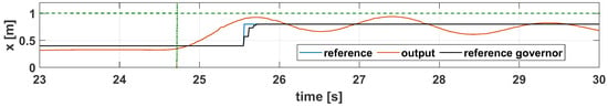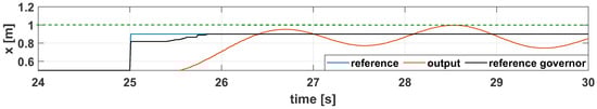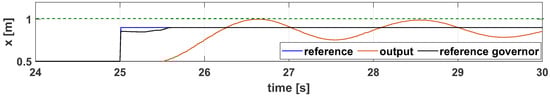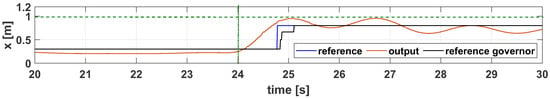 DoS attack 2 implies a delay of eight samples, with the same scenario described previously. When we use the baseline control structure, the safety constraint are violated as before. If we add the RG for low-level cyberattack mitigation, we obtain the result from Figure 10, where we can see that response is with damped oscillations, and it does not violate the safety constraint. The RG modifies the reference as shown more clearly in the zoomed version from Figure 11: the reference is first increased to a value of about m, and only after s it reaches the desired reference value.