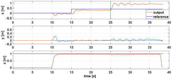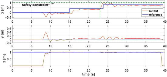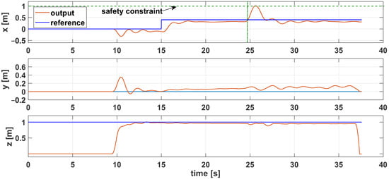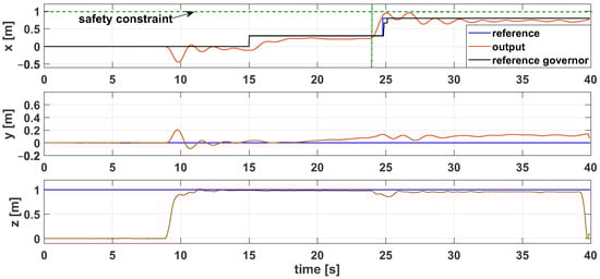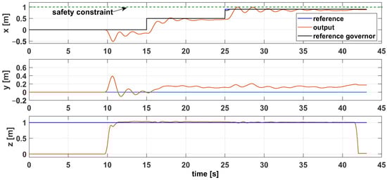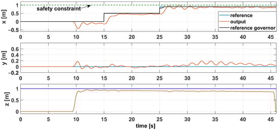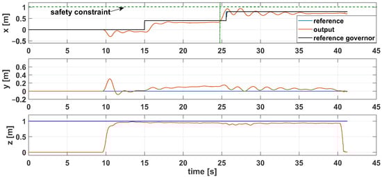For DoS attack 1, we increase the network transmission delay from one sample to six samples, at time moment s. In this scenario, the drone moves on the X axis, tracking multiple step references (equivalent results could have been shown for the Y axis). The constraint on X axis is , i.e., the safe space on X is m. Figure 6 shows the results using the baseline network control structure without the RG. The first 10 s are the take off initialization phase. The tracking controller exhibits some steady state error due to modeling uncertainties, but we consider the control performances satisfactory for the purpose of this paper—i.e., resilience to cyberattacks. It can be noticed that due to the increase in the network transmission delay (DoS attack), the step reference at time s induces oscillations that violate the constraint (dashed green horizontal line). This can be seen more clearly in the zoomed version from Figure 7. Figure 8 shows that when using the RG approach proposed in this paper (see the control structure from Figure 4), the safety constraints are no longer violated, thus ensuring resilience to this type of cyber attack. This is performed through the fact that the RG anticipates the safety constraint violation based on the model and the time delay information, and as response it increases the reference more gradually (slowly), as shown in Figure 9, thus reducing the oscillations. The reference is first increased to a value of about m, and it gradually reaches the desired reference value after s.