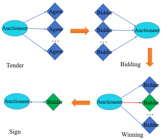 From the perspective of decision-makers, the task allocation process based on CNP mainly includes four stages: Tender, Bidding, Winning, and signing, as shown in Figure 1. Each agent can simultaneously serve two roles, namely, Tenderer and Bidder. In the CNP-based task assignment process, participants are composed of task allocators and recipients and make decisions as bidders and tenderers according to their respective tendering mechanisms and bidding mechanisms [26]. Different problems can specify different tendering and bidding mechanisms to achieve the optimal task resource allocation scheme. As for the DSTCA problem, the adjustment of the distribution scheme needs to meet certain conditions, and the specific execution ways of the tendering mechanism and bidding mechanism will be different under different conditions.