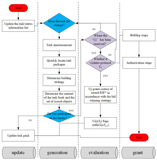 Each Agent determined to participate in the bidding task adds a new task to the task package and then uses the mission chain contract network protocol in Section 3.3 to calculate the highest score as the bidding value. Use the bid values of the bid as the bid set in Section 3.4 to generate the bid strategy. Successful bidding agents complete new tasks without the need for additional consensus stages. For an Agent with a premium outbid, the task is released from the package and updated through communication. The specific algorithm flow is shown in Figure 2.