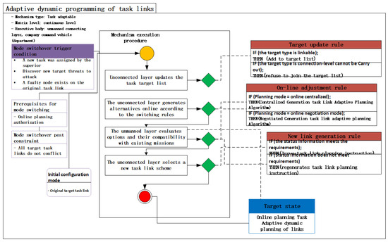 The command is responsible for the dynamic link adaptability planning, which belongs to the task adaptability mechanism of the task domain. Its main objectives are to update the list of task objectives online, plan for new task target links, support link reconstruction rules, and detect and evaluate the integrity and compatibility of attack links. The triggering conditions are as follows: a new task is assigned from the superior, a new target is discovered, and a faulty node exists on the existing link. The mode-switching rule base includes the target update rule, original task link reconstruction rule, new link generation rule, link integrity, compatibility detection and evaluation rule, etc. The specific steps of the implementation of the mechanism are: