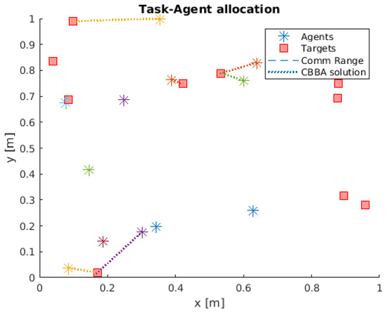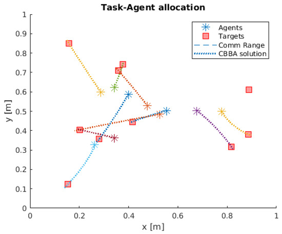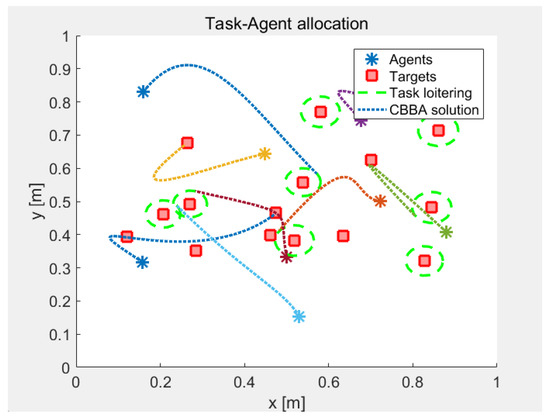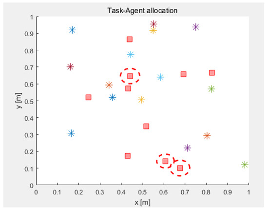 At the beginning of the war, the pre-task planning scheme was generated. First, 10 agents are set to perform 10 tasks, and the performance control parameter is . Use ode45 differential solver to solve, adjust parameter , By changing the location information through setting, the UAV Agent must try to reach the position at time . sets the specific type of task, which consists of task entities with different functions. Set, the number of iterations. The task scheduling scheme is shown in Figure 4. Therefore, the DSTCA model is used to calculate task redistribution. As shown in Figure 4 and Figure 5 the parameter value of Agent-task is 10–10, and the parameter setting of 20–20, respectively. The asterisk indicates the agent, the red square indicates the target, the dotted line indicates the path, and a blue dotted line indicates the CBBA assignment method.