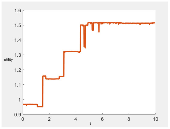 In the fourth part and the fifth part, two sets of different experimental parameters and are set respectively. To ensure the completeness of the experiment and test the algorithm index, the total utility calculation convergence of these two sets of parameters is carried out respectively. The experimental results are shown in Figure 17 and Figure 18. The total utility a and b show different utility result values. In the case of different parameter Settings, the Settings of task and agent are 10–20 and 8–15 respectively, and if the Settings are the same color and background cloth, it is easy to mistake that two pictures of the same graph are placed. Therefore, it is carefully observed that although they have different parameter Settings, they all converge to a single vertex. The convergence process is represented by the gradient change, so the utility value can converge to 8 as the task is executed. Then the improved algorithm is compared with the original CBBA algorithm.