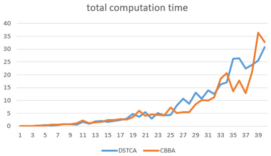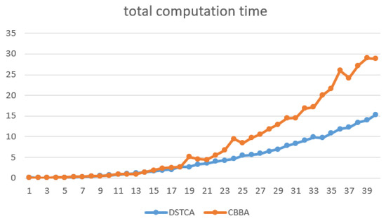 Based on Section 3, we improved the CBBA algorithm, and the simulation model of multi-task assignment is established. First, 10 UAV entities are selected to perform 20 tasks. The running diagram of the simulation process is shown in Figure 4 and Figure 5 The task cluster was established to improve the efficiency of task allocation and execution. The parameters were set as and , respectively, and the tests in Table 3 were carried out (Figure 6 and Figure 7). The dotted line in the Figure represents the trajectory process performed by the UAV entity, and the task target is represented by the square entity. The mission packet is represented by a dotted circle, the asterisk is represented by the drone entity, and DSTCA-CBBA determines the direction of the dotted line. Therefore, the normal operation of Figure 4, Figure 5 and Figure 6 has shown the preliminary implementation of the algorithm simulation. Then the score, utility, and time need to be analyzed and compared.