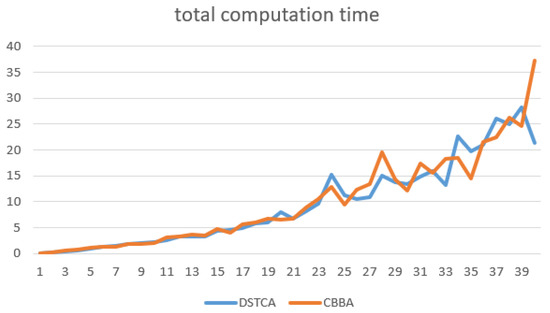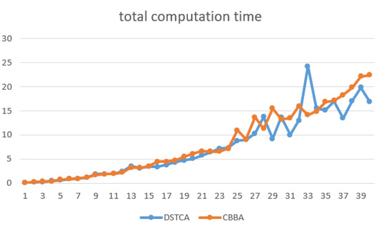 As shown in Figure 13, Figure 14 and Figure 15, DSTCA is marked in blue, and CBBA original algorithm is marked in orange. When there is no task change at the beginning, the task consumption time of the DSTCA algorithm is relatively small. The time consumption of both algorithms fluctuates with the sudden change of tasks, and then gradually flattens out when the cluster starts executing tasks. When the task changes, the difference in time consumption between the two algorithms is not large. However, you can still see that DSTCA consumes slightly less time. This shows that the algorithm is effective.