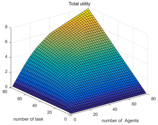 By using the solution framework in Section 3 and the improved CBBA algorithm in Section 4, the three-dimensional data graph of tasks, Agents, and time cost is established, as shown in Figure 8, Figure 9, Figure 10 and Figure 11. The time cost is relatively independent of the number of tasks and Agents.When the number of tasks increases, the global utility value increases linearly with the number of tasks Figure 12, while the increase of utility increases exponentially with the number of Agents. The larger the problem-solving space, the more task requirement needs to be executed. Agents will choose the nearest mission area, and the higher the reward value will be.