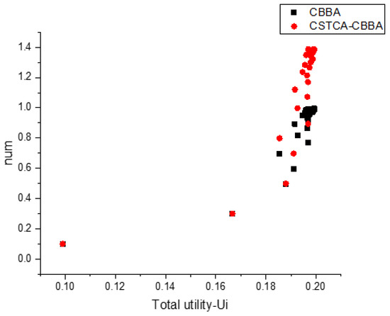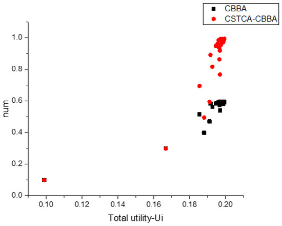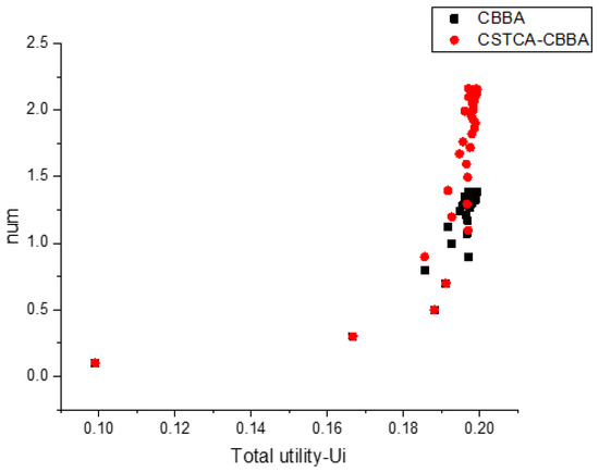 Set A3, and set the number of iterations to (Figure 19), (Figure 20), and (Figure 21) respectively. using the real-time efficacy protocol-based CSCTA-CBBA algorithm and the original algorithm CBBA for comparative analysis. Calculate utility analysis for F2 times.