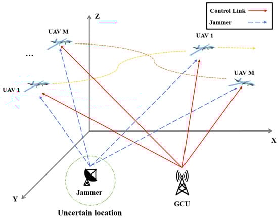 The studies mentioned above primarily focus on enhancing the system’s data transmission capacity through the joint optimization of UAV trajectories and resource allocation, while overlooking the impact of external interference. To explore this issue, the authors in [16,17] conducted research on interference resistance technologies in multi-UAV systems. Specifically, the authors in [16] considered a scenario where rotary-wing UAVs assist multiple ground users in communication. This approach employed frequency division multiplexing and trajectory optimization to reduce the interference signals and improve service quality. In [17], the authors expanded on the communication scenario in [16] by considering the joint optimization of UAV trajectories, speed, acceleration, and altitude. This approach aimed to reduce interference evoked by the radiation stations, thereby further enhancing the system’s communication performance. Furthermore, some studies [18,19] have studied the joint optimization of UAV swarm trajectories and communication in scenarios with uncertain external interference, an approach which is more suitable for realistic scenarios. In [18], the authors proposed an efficient method for joint optimization of UAV swarms’ trajectories and power under uncertain eavesdropper location information to maximize the secrecy rate in UAV-assisted cognitive radio networks. Meanwhile, the authors in [19] explored the maximization of throughput in UAV-assisted communication systems, where multiple users communicate with UAV swarms in scenarios where eavesdroppers’ locations are uncertain. It ensures the required quality of service (QoS) for each user by optimizing the UAVs’ trajectories and transmission power. To meet diverse QoS requirements across different applications, the authors in [20] investigated the problem of maximizing throughput in a UAV-assisted communication system. They analyzed a scenario where multiple ground users interact with a multi-UAV swarm while contending with jammers that have uncertain location information.