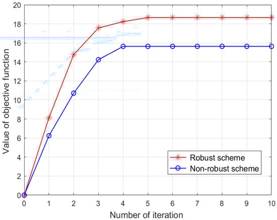 First, our experiment verified the convergence of the proposed algorithm compared with the nonrobust scheme The iteration processes of the robust scheme and nonrobust scheme are shown in Figure 2. From the figure, it can be observed that, in the scenario with the jammer location uncertainty radius , the objective function values of both algorithms increased rapidly with the number of iterations. However, the nonrobust scheme converged after four iterations, whereas the robust scheme required five iterations to converge. This is because the robust scheme needs additional computational effort to address the semi-infinite constraints arising from the uncertainty in the jammer information, whereas the nonrobust scheme does not have to account for this constraint, making it easier to converge.