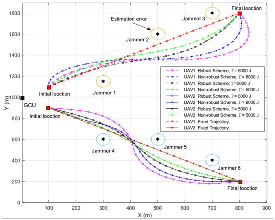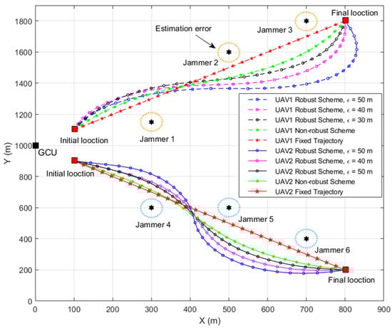 Next, we modeled the multi-UAV trajectory curves under three different algorithms. Figure 3 depicts the UAV trajectories in a scenario with a jammer location uncertainty radius of , considering different energy constraints and algorithms. It can be seen that, compared to the nonrobust scheme, the UAV trajectories under the proposed robust scheme were farther away from the jammers. This is because increasing the distance between the UAVs and the jammers reduces the interference, thereby improving communication quality with the GCU. This demonstrates that the proposed robust scheme provides a more reasonable trajectory planning for the UAV swarm. Additionally, it can be seen that, with the same algorithm, UAV trajectories were farther from the jammers when the energy consumption limit was higher compared to a lower energy limit . Clearly, higher energy allowances enabled the UAVs to find better trajectories to counteract the interference, something which is intuitively validated by this experiment.
