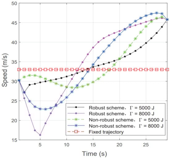 Figure 5 shows the uppermost flying UAV from Figure 3 and depicts its velocity variations. From the figure, it is evident that, for both the robust scheme and the nonrobust scheme, UAVs initially started with relatively low speeds to maintain high-quality communication with the GCU at close distances. As the UAVs progressively distanced themselves from the GCU and got closer to the jammers, their communication quality was significantly affected. At this point, the UAVs altered their flight path to circumvent interference (as shown in Figure 3) and increased their speed to move farther away from the jammers. This demonstrates that our simulation aligns well with practical scenarios.