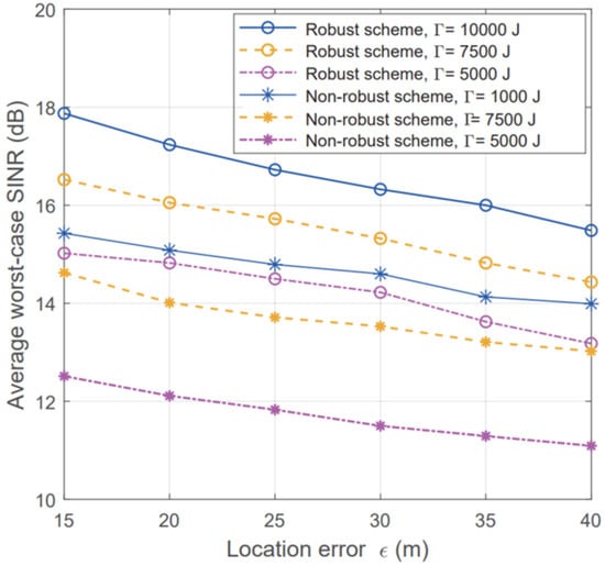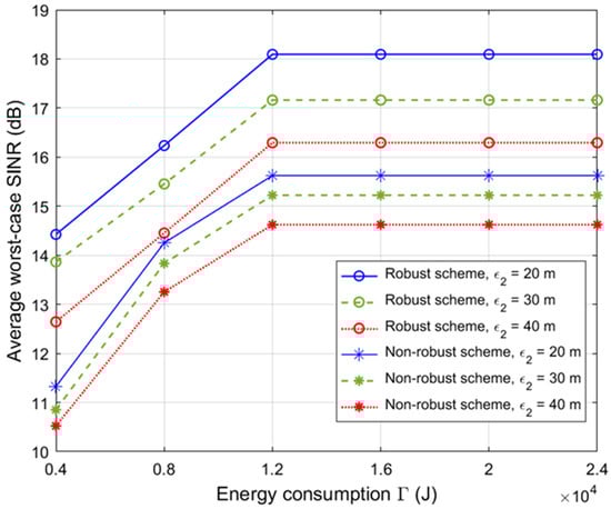 In what follows, Figure 6 compares the performances of the robust scheme and the nonrobust scheme in terms of average worst-case SINR for the UAV swarm at various energy consumption levels. It can be observed that, compared to the nonrobust scheme, the proposed robust scheme enabled the UAV swarm to achieve a higher average worst-case SINR, approximately 115% higher. The analysis indicates that this improvement in swarm performance can be attributed to the robust scheme optimizing UAV flight trajectories more effectively, thereby reducing external interference and enhancing communication quality. Furthermore, it is observed that, as the energy consumption limit increased, the communication performance of the swarm gradually improved. However, beyond a certain threshold, increasing no longer enhanced the communication performance of the UAV swarm under different algorithms. This occurred because, when the UAVs have a lower energy consumption limit, increasing allows them to use more energy to explore better trajectories, thereby improving SINR. Yet when becomes sufficiently large, the optimal trajectory for the UAV swarm requires less energy than the current limit, meaning that further increasing does not enhance communication performance.