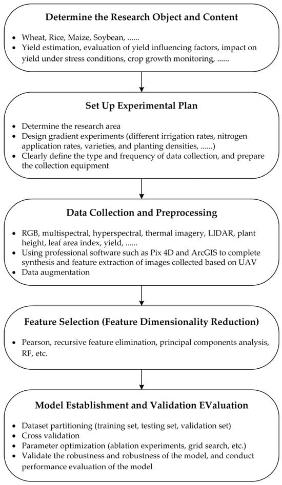 The purpose of this study is to comprehensively summarize ML research on grain crop yield prediction using UAV remote sensing data. By reading a large number of research papers in the literature on yield estimation, we summarize the process of yield estimation as follows: determining the research object and content, setting experimental plans, data collection and preprocessing, feature selection (feature dimensionality reduction), model establishment, and validation evaluation; see Figure 1.