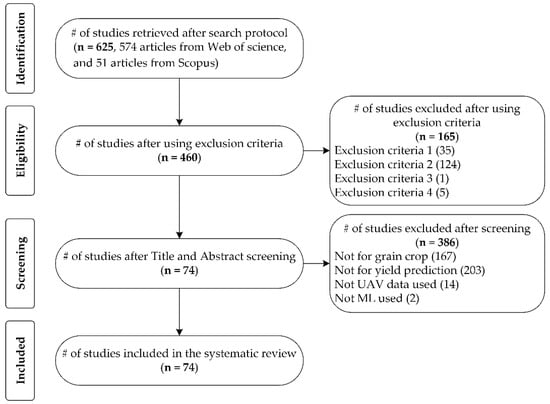 - Their research task is not yield estimation, but monitoring of crop growth or crop pests and diseases. Such as references [36,37,38], the abstract contains all the search strings, but the final task is to monitor the LAI. This is due to the mentioned importance of LAI for yield estimation and use of UAV remote sensing data and ML methods.