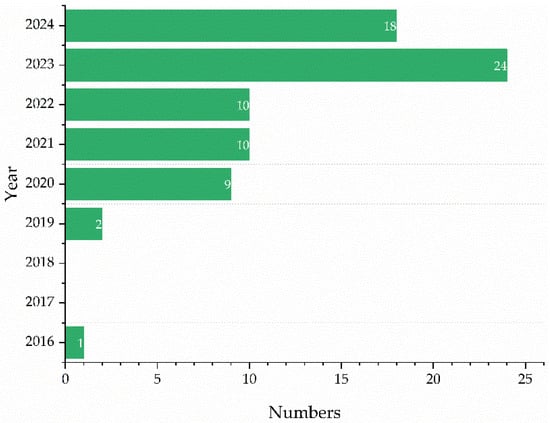 We summarized and analyzed 74 articles retrieved from two electronic databases based on the specific exclusion criteria in this review. Figure 3 shows that research on estimating grain crop yield based on UAV remote sensing data and ML began in 2016. In this study [41], the authors collected multispectral images of soybeans via a UAV platform and modeled yield estimation using the random forest (RF) algorithm, demonstrating the feasibility of the method. Meanwhile, this study also conducted research on soybean maturity classification. There were no relevant reports in 2017 and 2018, until 2020, when the number of reports increased significantly. By 2023, this number reached 24 articles. This may be due to the rapid development of DL, which is favored by a large number of researchers and has been gradually applied to the field of agriculture, providing new ideas and methods for yield estimation research. Of course, this is only a result obtained based on two databases and specific exclusion criteria. Relevant research results conducted in 2017 and 2018 may be retrieved from other databases, but we believe that these data can also represent a development trend.