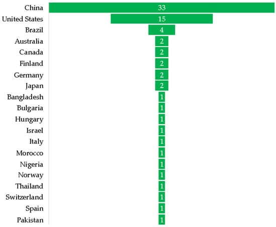 In addition, we also counted the nationality information of the authors who published the relevant research articles (the data were derived from the nationality of the first author). As shown in Figure 4, China and the United States are far ahead in the number of reports on crop yield estimation based on UAV remote sensing and ML. After further exploring their main research crops, we found that for China, wheat yield estimation received more attention, while for the United States, it was corn. We also conducted a statistical analysis of the articles included in these reports, with 74 articles published in 31 different journals, focusing mainly on Remote Sensing, Computers and Electronics in Agriculture, Frontiers in Plant Science, Precision Agriculture, Agronomy, Drones, and The International Journal of Applied Earth Observation and Geoinformation. The number of articles published is 17, 9, 5, 5, 4, 3, and 3, respectively. For more details, please refer to Table 2.